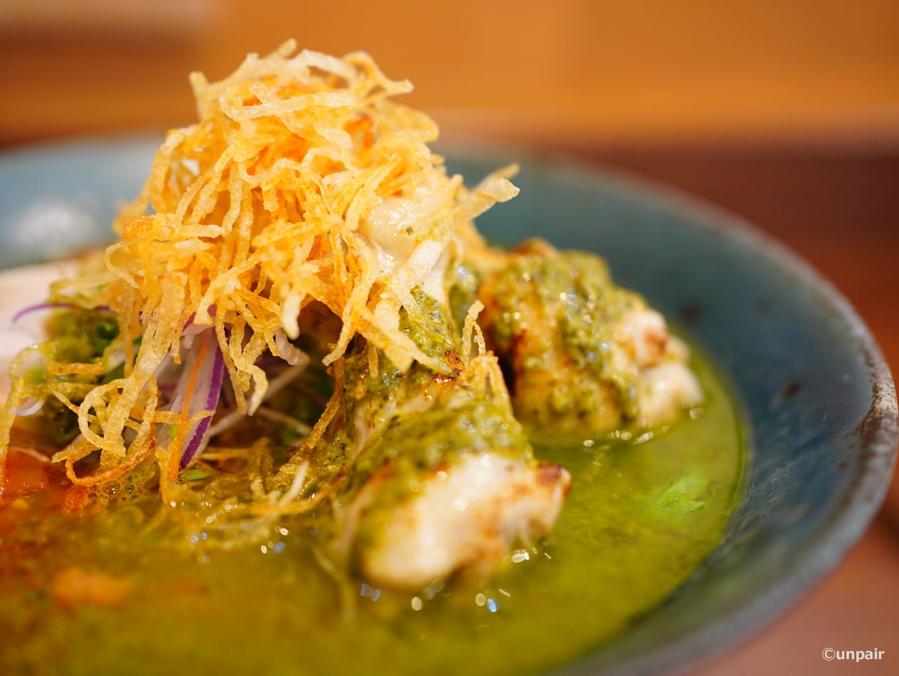 ホロホロの手羽元にカリカリポテトがトッピングされています。
