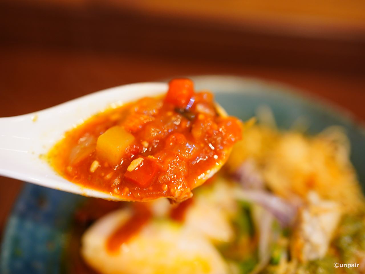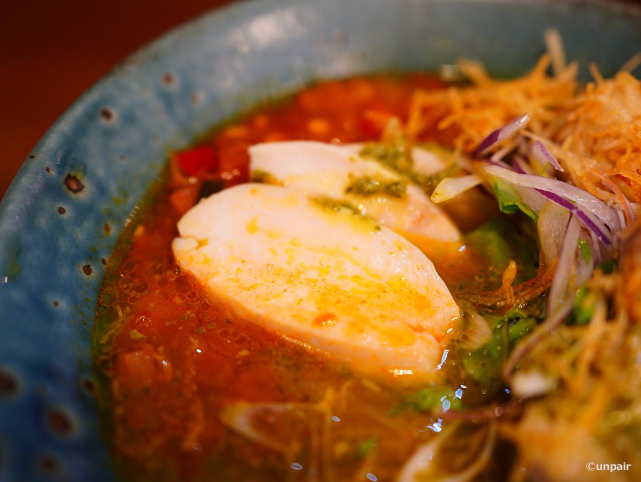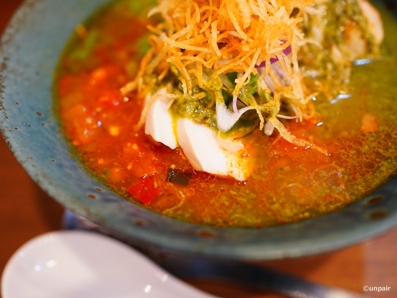 そこに色どり野菜のトマトソースがかけてあるので徐々にトマトラーメンになっていきます。